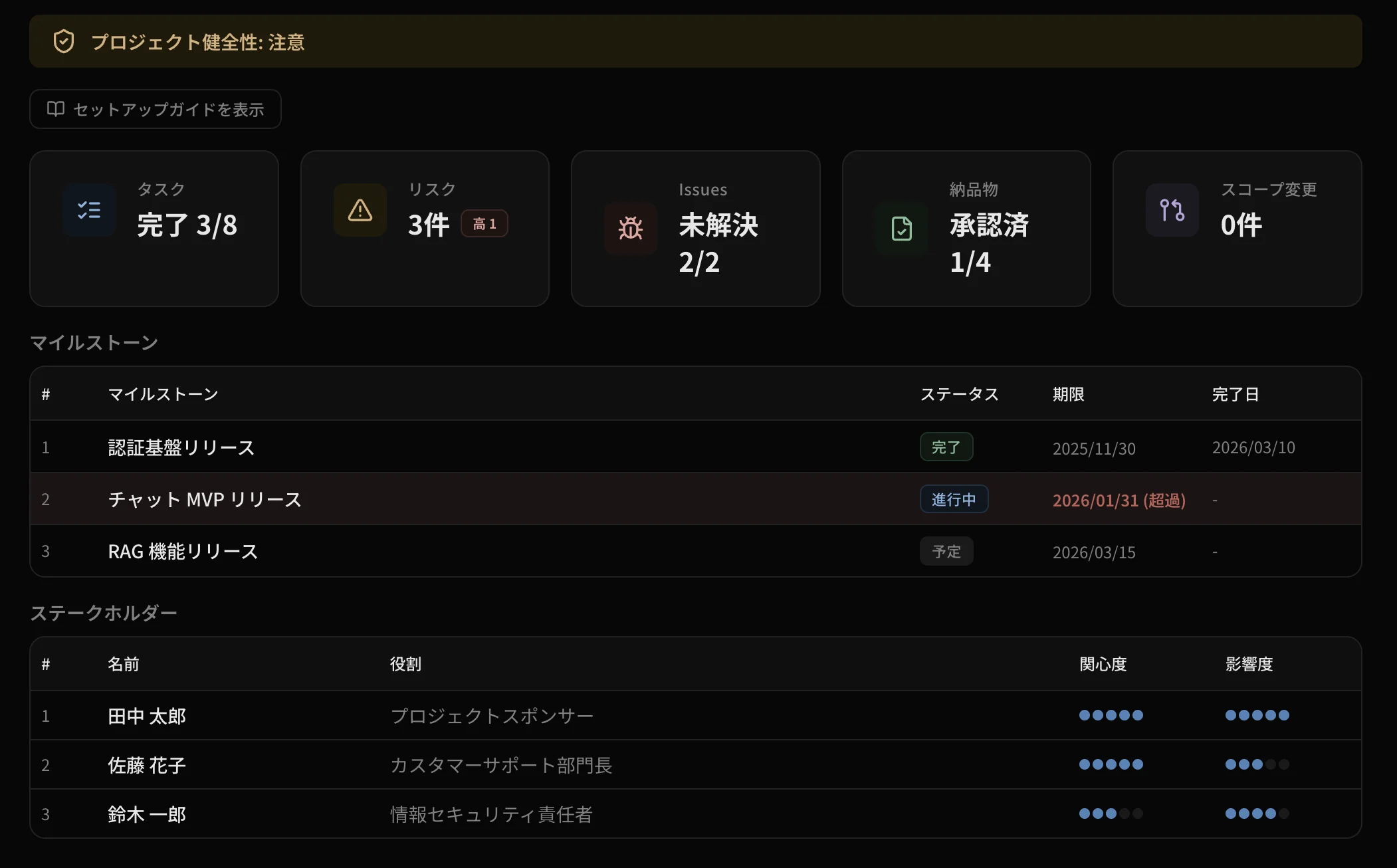 タスク・リスク・Issue・成果物の状態を一画面で把握。AI が更新するから情報は常に最新。